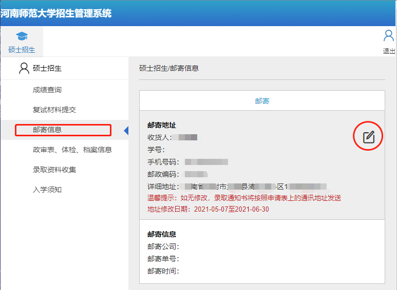 2、考生選擇“郵寄信息”模塊核對確認(rèn)郵寄信息,若需修改請點擊右上角修改圖標(biāo)進(jìn)行信息修改。修改完成后點擊“保存修改”。填寫詳細(xì)地址字段時請務(wù)必將“省-市-縣-區(qū)-街道-門牌號”等信息填寫完整。
