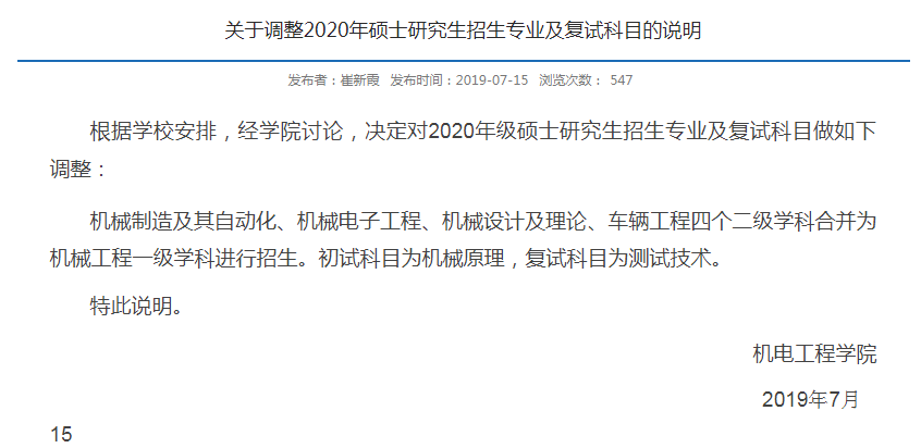 機(jī)械制造及其自動化、機(jī)械電子工程、機(jī)械設(shè)計及理論、車輛工程四個二級學(xué)科合并為機(jī)械工程一級學(xué)科進(jìn)行招生。初試科目為機(jī)械原理,復(fù)試科目為測試技術(shù)。