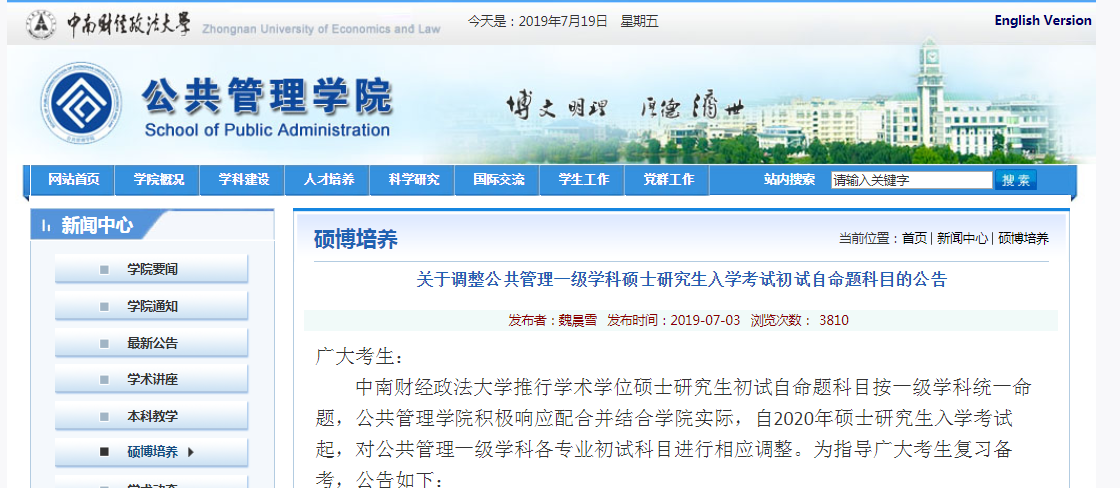 中南財(cái)經(jīng)政法大學(xué)關(guān)于調(diào)整公共管理一級學(xué)科研究生入學(xué)考試初試自命題科目公告