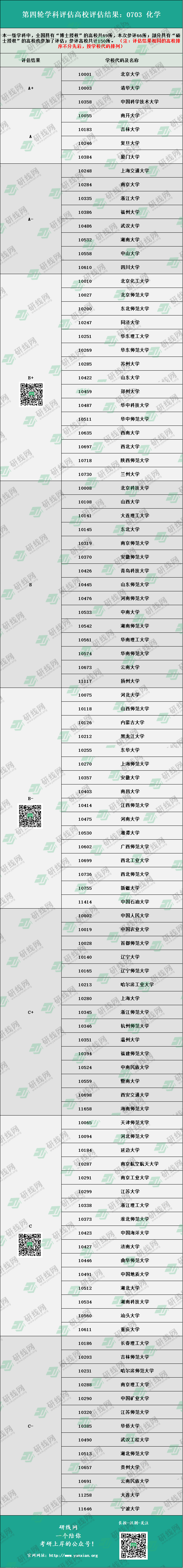 下面是全國第四輪學科評估結果[0703 化學]的院校排名,供大家擇校參考。(注:評估結果相同的高校排序不分先后,按學校代碼排列)