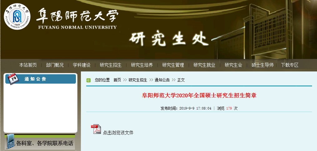 忙于備考的同時,也應該關注一下院校官方信息的發布,比如2020年研究生招生簡章。今天,小編整理了“阜陽師范大學2020年全國碩士研究生招生簡章”的相關內容!有相關報考意愿的同學注意一下!