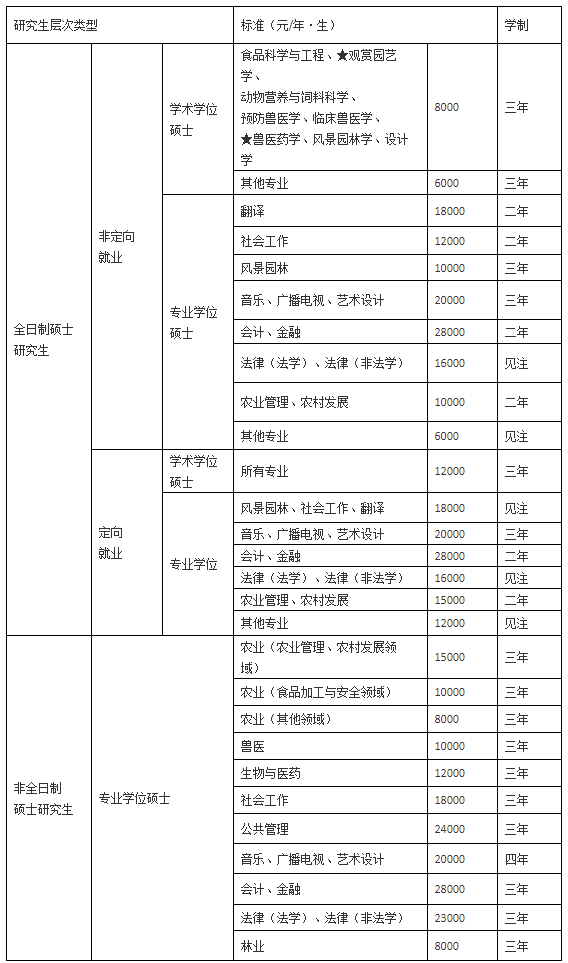 注:風景園林、農藝與種業(yè)、資源利用與植物保護、畜牧、漁業(yè)發(fā)展、食品加工與安全、農業(yè)工程與信息技術、林業(yè)、電子信息、機械、生物與醫(yī)藥、工程管理、法律(非法學)等類別(領域)學制為三年;翻譯、社會工作、法律(法學)等類別(領域)學制二年。