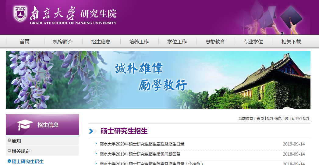 2020年碩士研究生招生簡章陸續已出,今天小編給大家整理的是“南京大學2020年碩士研究生招生章程及招生目錄”的相關內容,有報考意愿的小伙伴要注意下哦!