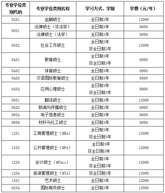 學術型碩士學習方式全部為全日制,學制3年,每學年學費8000元;各專業型碩士學習方式、學制及學費見下表: