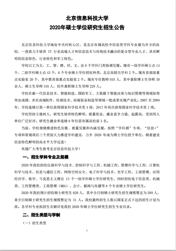 北京信息科技大學(xué)2020年碩士學(xué)位研究生招生公告