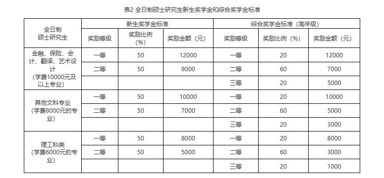 學校以“獎勵優良學生,提高教育質量,補助基本生活,提高整體待遇,優化結構機制,促進科學發展”為目的,建立長效、多元的研究生獎助體系,適用于納入全國研究生招生計劃、無固定收入且檔案轉入學校的全日制研究生(除MBA)。學校研究生獎助學金體系由獎學金系列和助學金系列組成,獎學金系列分為國家獎學金、學業獎學金(覆蓋面為100%)和學校獎學金,助學金系列分為國家助學金、國家助學貸款和學校助學金(助管津貼、助研津貼、臨時特困補助)。優秀研究生還可申請研究生優秀學位論文獎、優秀研究生畢業生、研究生拔尖創新人才質量提升獎勵、國家公派獎學金項目和研究生科研創新基金項目,資助體系具體信息可登陸學校研究生招生信息網站查詢。全日制碩士研究生新生獎學金和綜合獎學金標準如下(見表2):