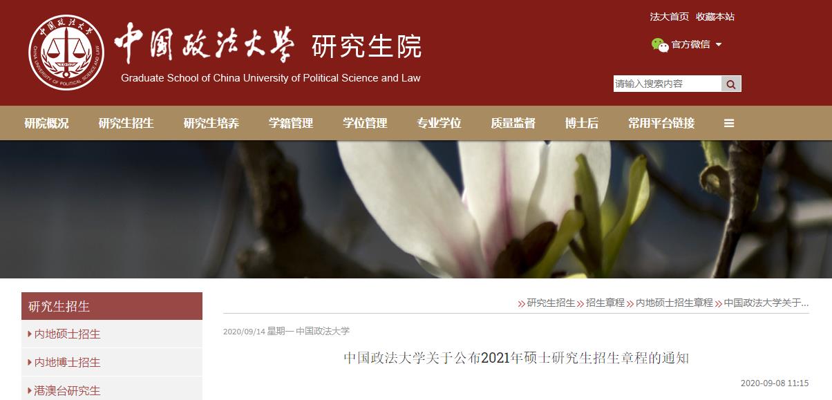 各位同學備考的同時,也要時刻關注院校官網的信息,小編將及時更新各院校2021年招生簡章,為考生提供第一手的招生信息,敬請關注。今天,小編整理了“2021考研招生簡章:中國政法大學2021年碩士研究生招生章程”的相關內容!下面我們一起來看一看!