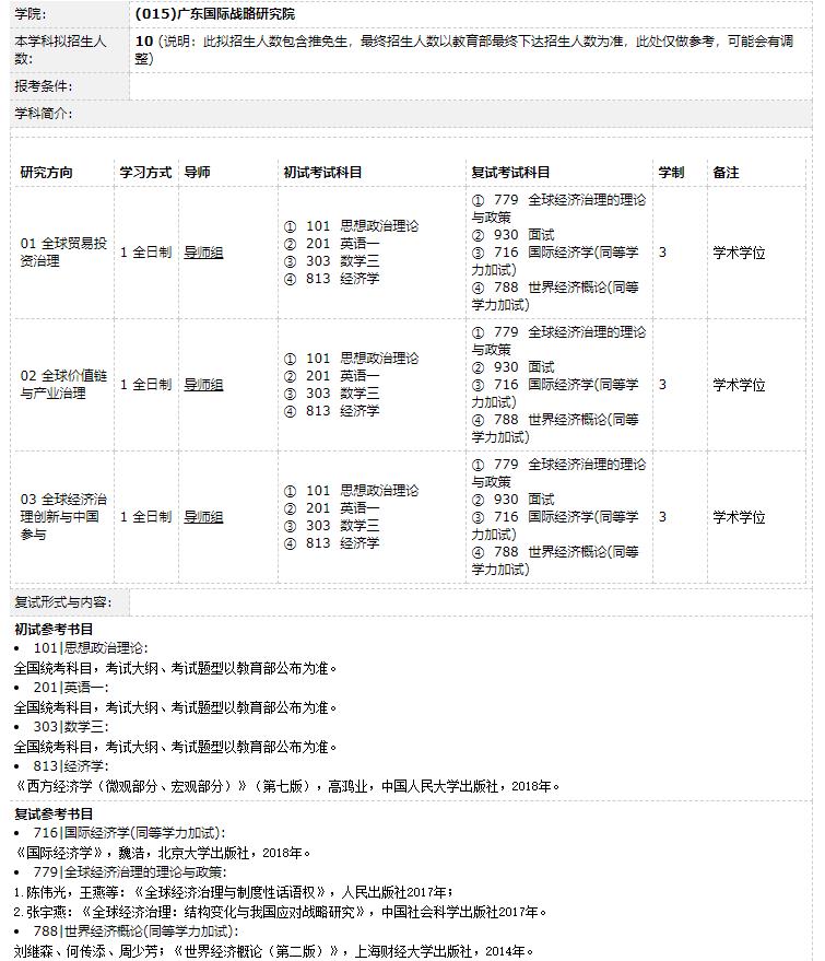 廣東國際戰略研究院全球經濟治理博碩士點自2019年開始招生,由廣東國際戰略研究院獨立招生、獨立管理。全球經濟治理是以全球經濟治理體系構建問題為研究對象的一門學科。全球經濟治理博碩點是依托于應用經濟學一級學科的跨學科博碩士研究生培養項目,下設全球貿易投資治理、全球價值鏈與產業治理、全球經濟治理創新與中國參與三個研究方向。專業師資隊伍實力雄厚,現有全球經濟治理碩、博士研究生導師11名。旨在培養具有全球視野,既了解經濟學、管理學、國際政治經濟學等學科領域的基本理論,又在國際貿易、國際投資、國際金融、國際產業戰略、跨國企業管理等學科領域的一個方向具有一定造詣的研究應用型高素質人才。