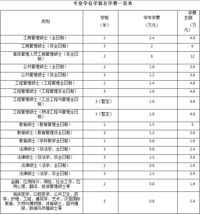 (二)學(xué)費(fèi):所有碩士研究生均按學(xué)制年限分學(xué)年收費(fèi)。學(xué)術(shù)學(xué)位碩士研究生每生0.8萬元/學(xué)年;專業(yè)學(xué)位碩士研究生學(xué)制及學(xué)費(fèi)標(biāo)準(zhǔn)見下表: