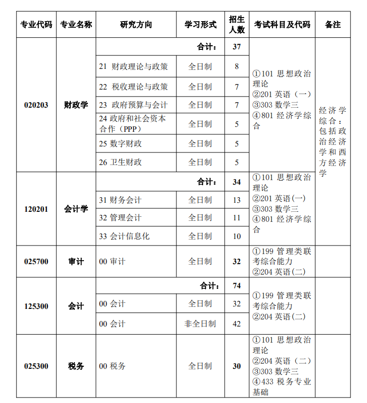 注:1.各專業(yè)(除非全日制會計專業(yè))名額均含推薦免試生及少數(shù)民族骨干計劃生,其中推免生總?cè)藬?shù)不超過招生總?cè)藬?shù)的50%。少數(shù)民族骨干計劃生名額分配:財政學(xué)6人、會計學(xué)3人、審計6人、全日制會計7人、稅務(wù)4人。少數(shù)民族骨干計劃招生事項詳見財科院《2021年“少數(shù)民族高層次骨干人才計劃”招收攻讀碩士學(xué)位研究生(全日制)招生簡章》。