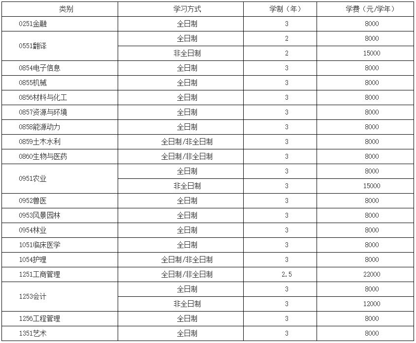 專業(yè)學(xué)位學(xué)習(xí)方式、學(xué)制和學(xué)費(fèi)見(jiàn)下表: