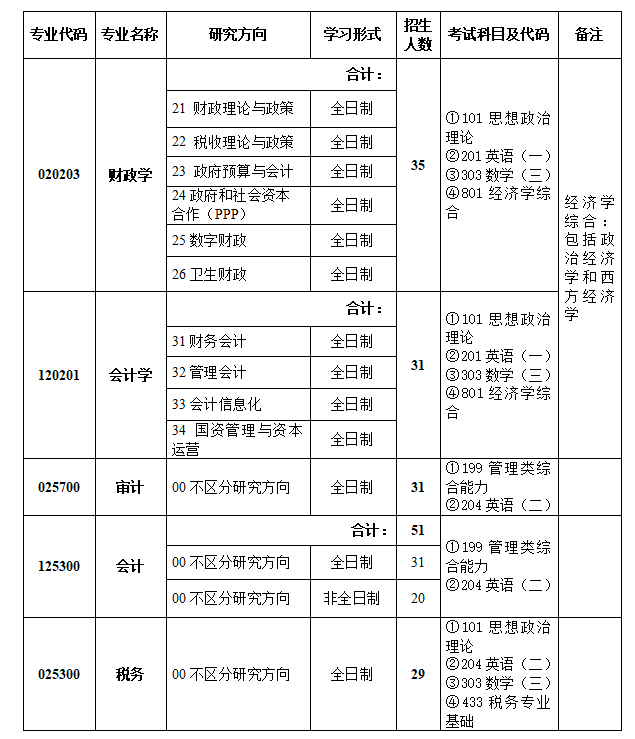 注:1.各專業(除非全日制會計專業)名額均含推薦免試生及少數民族骨干計劃生,其中推免生總人數不超過招生總人數的50%。少數民族骨干計劃招生名額分配:財政學5人、會計學2人、審計5人、會計6人、稅務3人。少數民族骨干計劃招生事項詳見財科院《2023年“少數民族高層次骨干人才計劃”招收攻讀碩士學位研究生(全日制)招生簡章》。