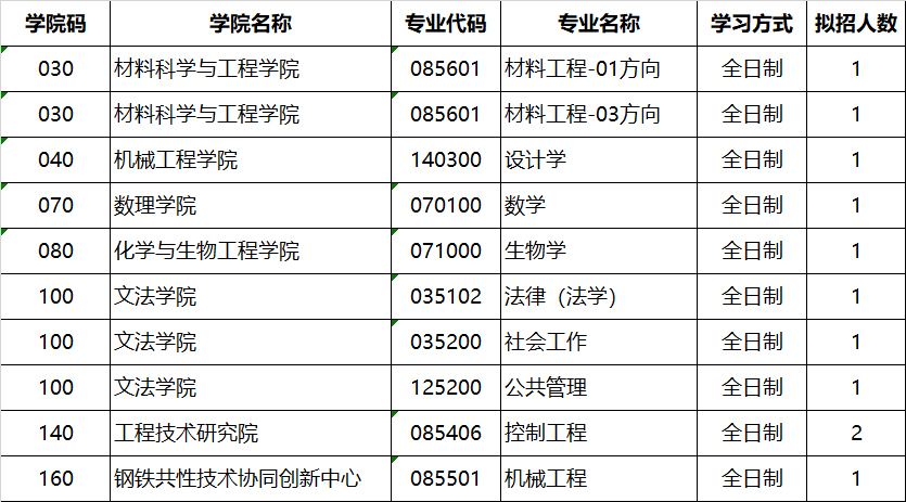24年我校碳中和研究院(院系代碼240)和前沿交叉科學技術研究院(院系代碼260)首次獨立招收碩士研究生;冶金與生態工程學院、碳中和研究院首次招收儲能化學與物理(專業代碼0806J4)專業碩士研究生;前沿交叉科學技術研究院首次招收納米科學與工程(專業代碼0805J5)專業碩士研究生。