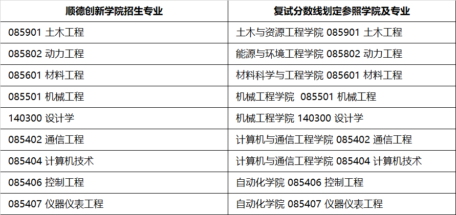 4. 2024年我校順德創新學院各招生專業將參照有關學院的對應專業劃定相同復試分數線,對應關系如下表。