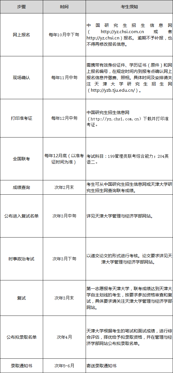 1. 凡報考天津大學MPAcc的考生必須按規定時間在網上提交報名信息,繳納報名費,并到所在報考點進行現場照相、確認網報信息,不經確認信息者網上報名無效。考生本人對網上報名信息進行核對并確認,經考生確認的報名信息在考試、復試及錄取階段一律不作修改。