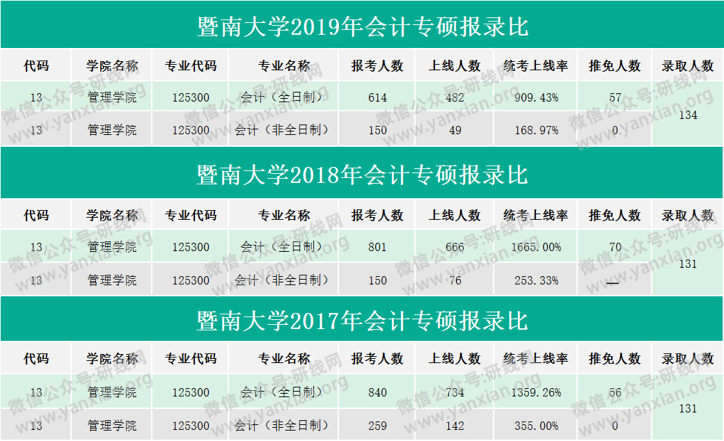 2017年暨南大學會計專碩(全日制)報考人數840名,上線人數734名,統考上線率1359.26%,推免人數56名。會計專碩(非全日制)報考人數259名,上線人數142名,統考上線率355%。2017年全日制和非全日制總錄取人數131名。