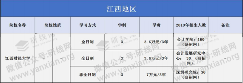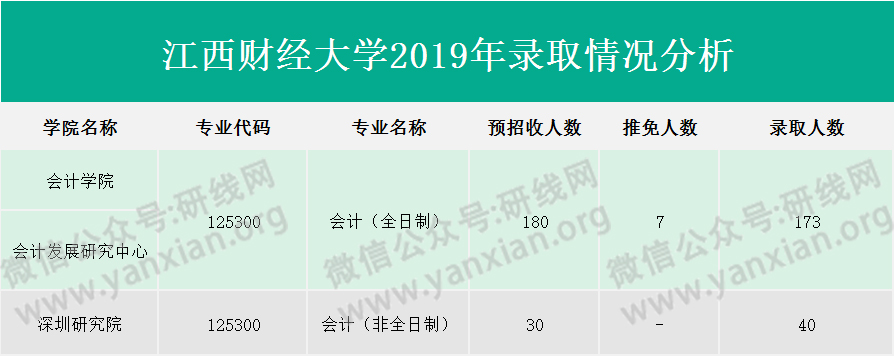 2019年江西財經大學實際錄取會計專碩全日制173人,其中推免7人,深圳研究院非全日制錄取40人。