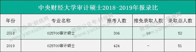 2020年的復試分數線和報錄比未確定,研線網整理了中央財經大學審計碩士2018-2019年的報錄比,供大家參考。