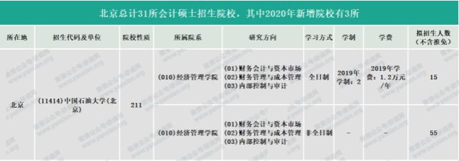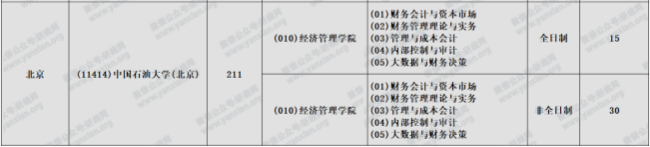 中國(guó)石油大學(xué)(北京)2021年會(huì)計(jì)專碩全日制計(jì)劃招生15人,非全日制計(jì)劃招生30人