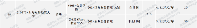 上海對外經貿大學全日制會計專碩學制學費:學制為2.5年,2020年學費為4.32萬元/年;非全日制會計專碩學制學費:學制為2.5年,2020年學費為5.12萬元/年