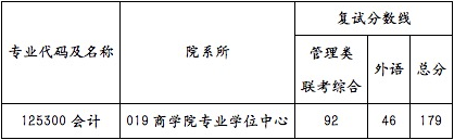 商學院學位中心會計專碩復試分數線為:179/92/46