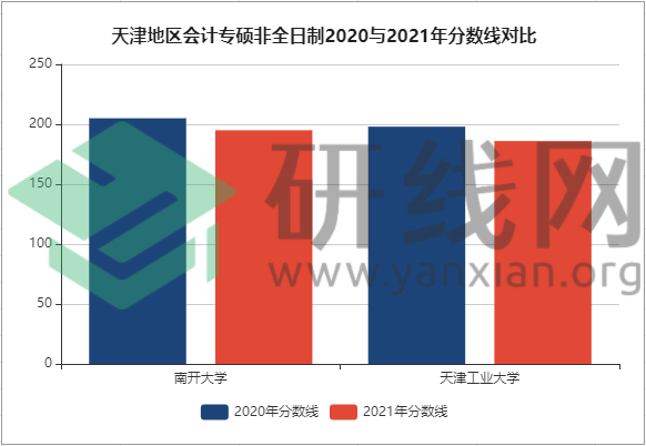 | 天津地區會計專碩非全日制2020與2021年分數線對比 | ||