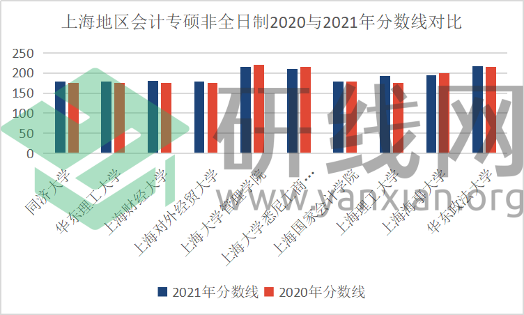 | 上海地區會計專碩非全日制2020與2021年分數線對比 | ||