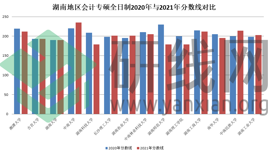 | 湖南地區會計專碩全日制2020年與2021年分數線對比 | ||