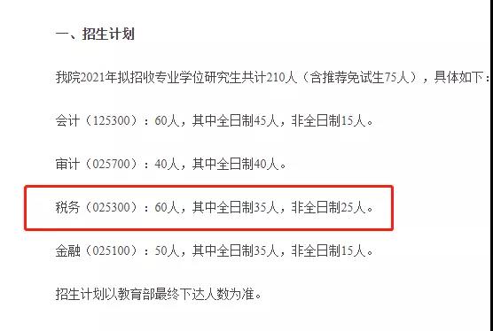 北京國(guó)家會(huì)計(jì)學(xué)院2021年稅務(wù)碩士計(jì)劃招生60人全日制35人,非全日制25人。