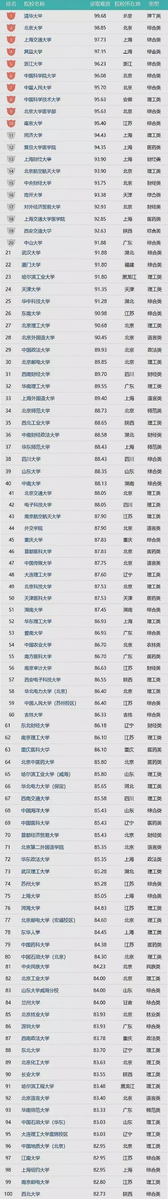 下面我們就來看看,院校錄取難度排行榜單TOP100: