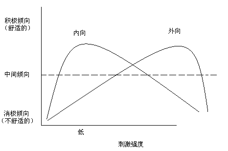 喚醒是指大腦皮層隨時(shí)準(zhǔn)備反應(yīng)的警覺狀態(tài),它取決于中樞神經(jīng)系統(tǒng)中上行網(wǎng)狀激活系統(tǒng)的激活水平。Eysenck認(rèn)為內(nèi)向者的大腦皮質(zhì)喚醒水平天生比外向者高,因此,對于同樣強(qiáng)度的刺激,內(nèi)向者比外向者體驗(yàn)的強(qiáng)度更高,因而更敏感。極強(qiáng)或極弱的水平的刺激都會產(chǎn)生消極的情緒體驗(yàn),只有中等強(qiáng)度的刺激才產(chǎn)生積極、快樂的情緒體驗(yàn),刺激強(qiáng)度水平與內(nèi)、外向者情緒體驗(yàn)之間的關(guān)系呈倒U型,而且內(nèi)向和外向者倒U形的峰點(diǎn)不同。如圖: