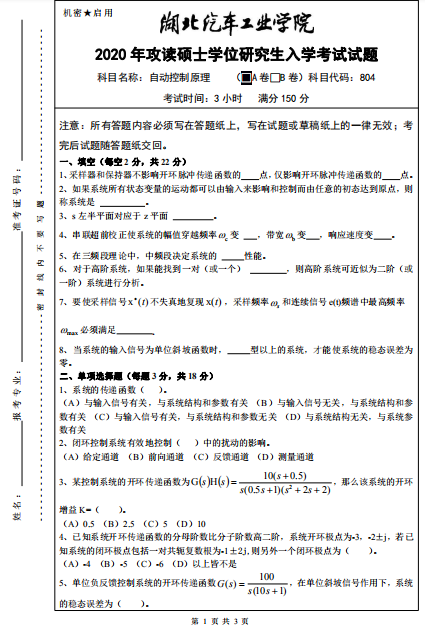 以上就是小編整理的“考研真題:湖北汽車工業學院804自動控制原理2020年攻讀碩士學位研究生招生入學考試試題”的全部內容!更多真題資料請關注“考研專業課真題”欄目!祝考研成功!