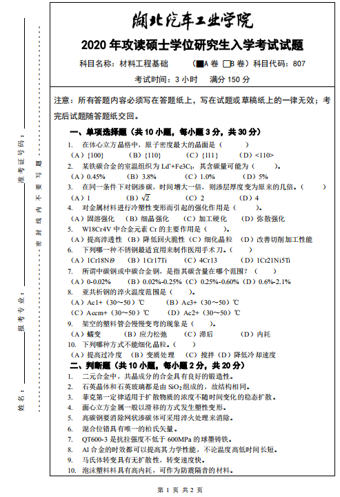 以上就是小編整理的“考研真題:湖北汽車工業學院807材料工程基礎2020年攻讀碩士學位研究生招生入學考試試題”的全部內容!更多真題資料請關注“考研專業課真題”欄目!祝考研成功!