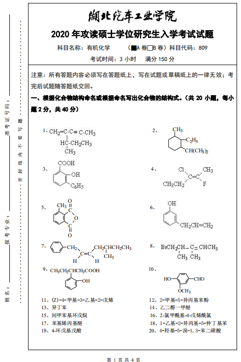 以上就是小編整理的“考研真題:湖北汽車工業學院809有機化學2020年攻讀碩士學位研究生招生入學考試試題”的全部內容!更多真題資料請關注“考研專業課真題”欄目!祝考研成功!