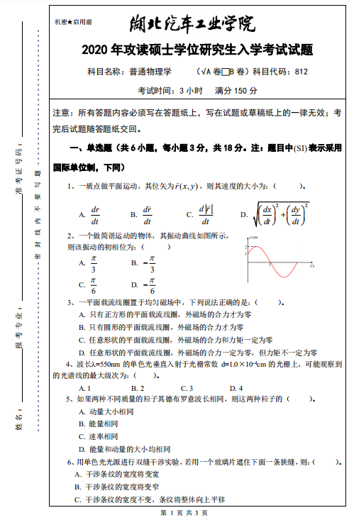 以上就是小編整理的“考研真題:湖北汽車工業(yè)學(xué)院812普通物理學(xué)2020年攻讀碩士學(xué)位研究生招生入學(xué)考試試題”的全部內(nèi)容!更多真題資料請(qǐng)關(guān)注“考研專業(yè)課真題”欄目!祝考研成功!