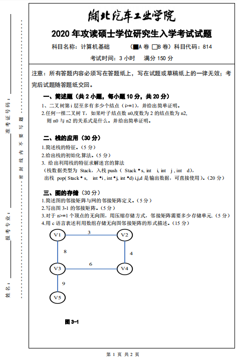 ?原文標題:2020年碩士研究生入學考試自命題試題