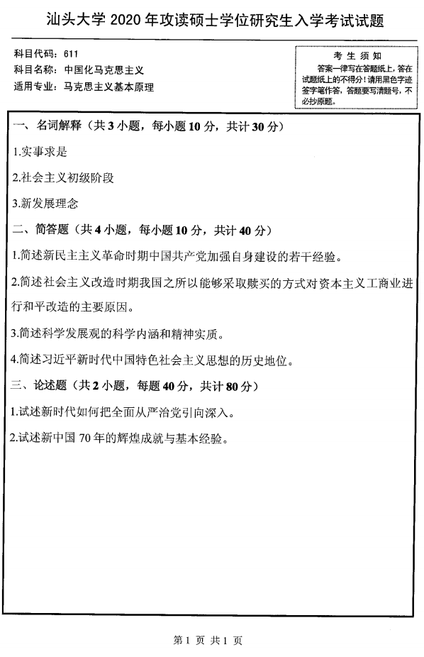 以上就是小編整理的“考研真題:汕頭大學611中國化馬克思主義2020年碩士研究生招生考試試題”的全部內容!更多真題資料請關注“考研專業課真題”欄目!祝考研成功!