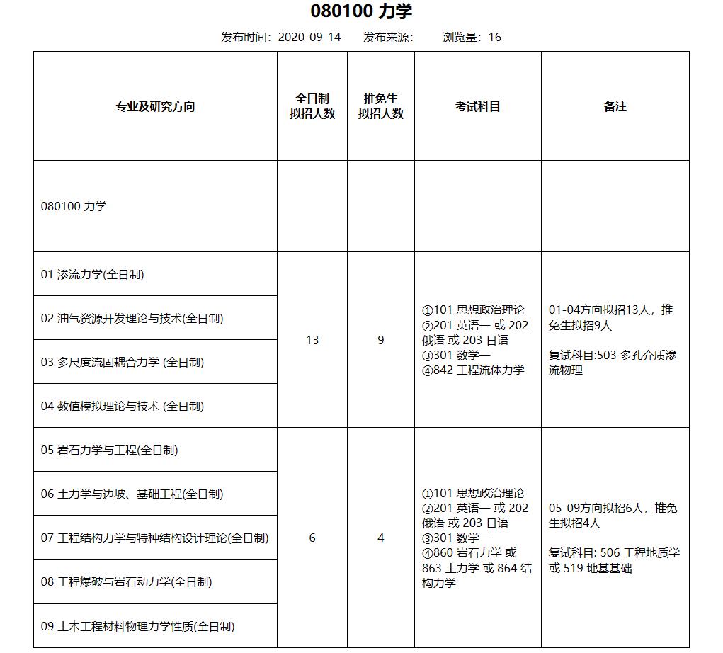 2021考研專業目錄:北京科技大學土木與資源工程學院080100 力學2021年碩士研究生招生專業目錄