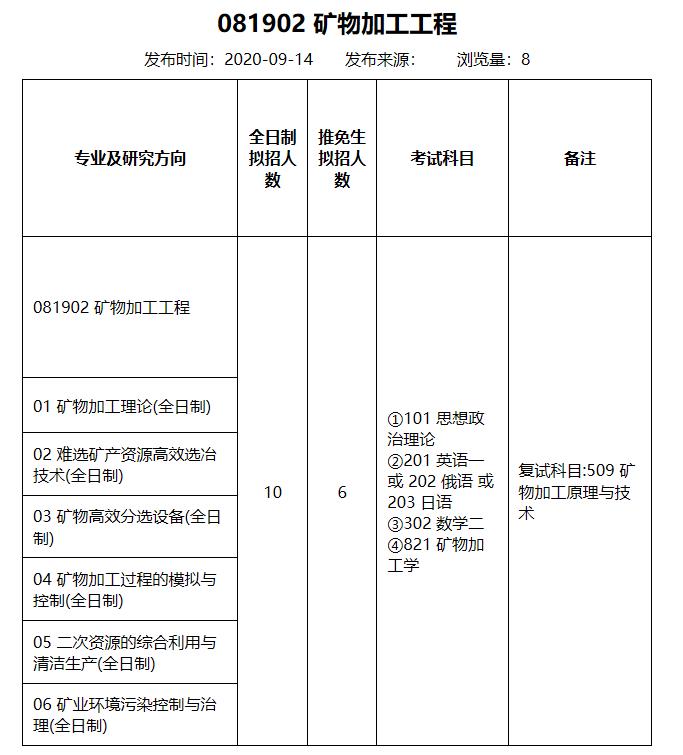 2021考研專業目錄:北京科技大學土木與資源工程學院081902 礦物加工工程2021年碩士研究生招生專業目錄
