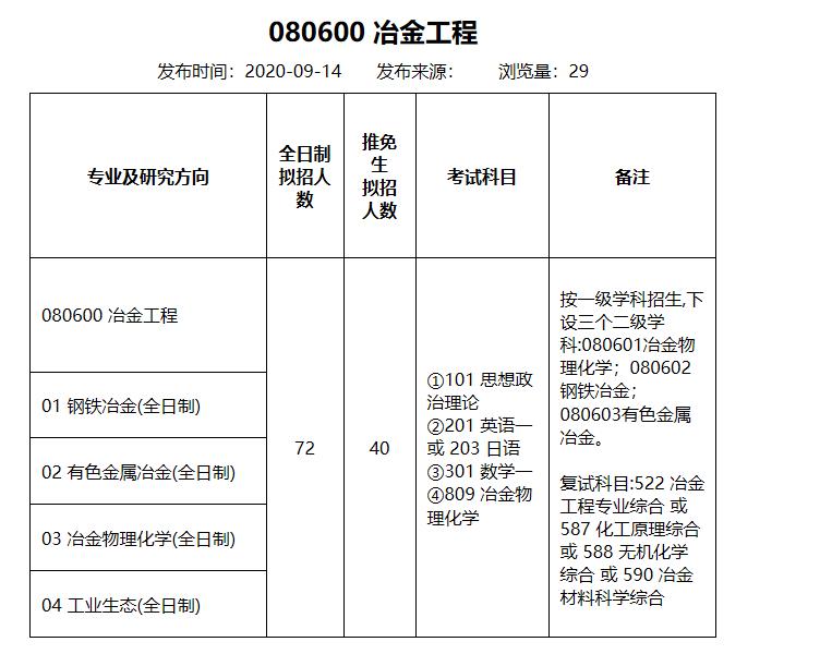 2021考研專業目錄:北京科技大學冶金與生態工程學院080600 冶金工程2021年碩士研究生招生專業目錄