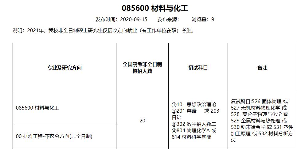 2021考研專業目錄:北京科技大學材料科學與工程學部085600 材料與化工(非全日制)2021年碩士研究生招生專業目錄