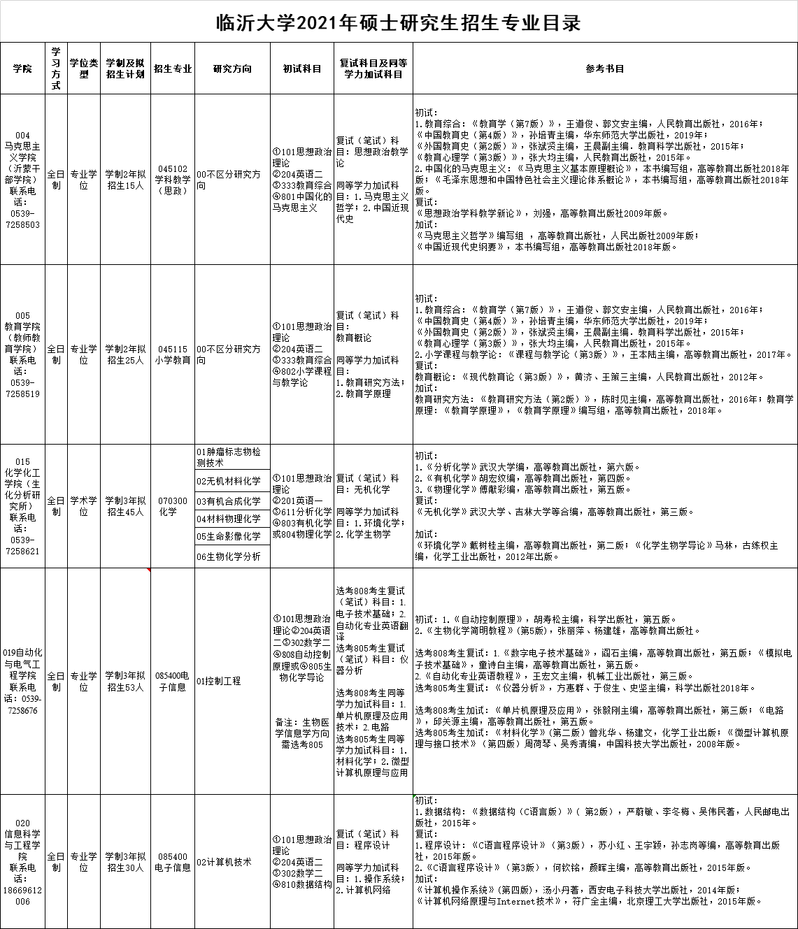 2021考研專業(yè)目錄:臨沂大學(xué)2021年碩士研究生招生專業(yè)目錄及參考書目