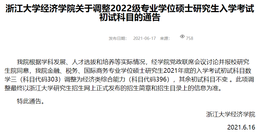原文標(biāo)題:浙江大學(xué)經(jīng)濟(jì)學(xué)院關(guān)于調(diào)整2022級(jí)專業(yè)學(xué)位碩士研究生入學(xué)考試初試科目的通告