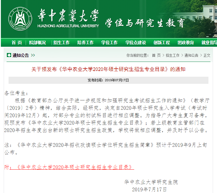 根據(jù)《教育部辦公廳關(guān)于進(jìn)一步規(guī)范和加強(qiáng)研究生考試招生工作的通知》(教學(xué)廳〔2019〕2號(hào))精神,結(jié)合實(shí)際,經(jīng)研究,決定自2020年碩士研究生入學(xué)考試(考試時(shí)間2019年12月)起,對(duì)部分專業(yè)的初試科目進(jìn)行相應(yīng)調(diào)整。為指導(dǎo)廣大考生復(fù)習(xí)備考,現(xiàn)預(yù)發(fā)布《華中農(nóng)業(yè)大學(xué)2020年碩士研究生招生專業(yè)目錄》;若上級(jí)教育主管部門在2020年招生年度出臺(tái)新的碩士研究生招生政策,學(xué)校將做相應(yīng)調(diào)整,并及時(shí)予以公告。
